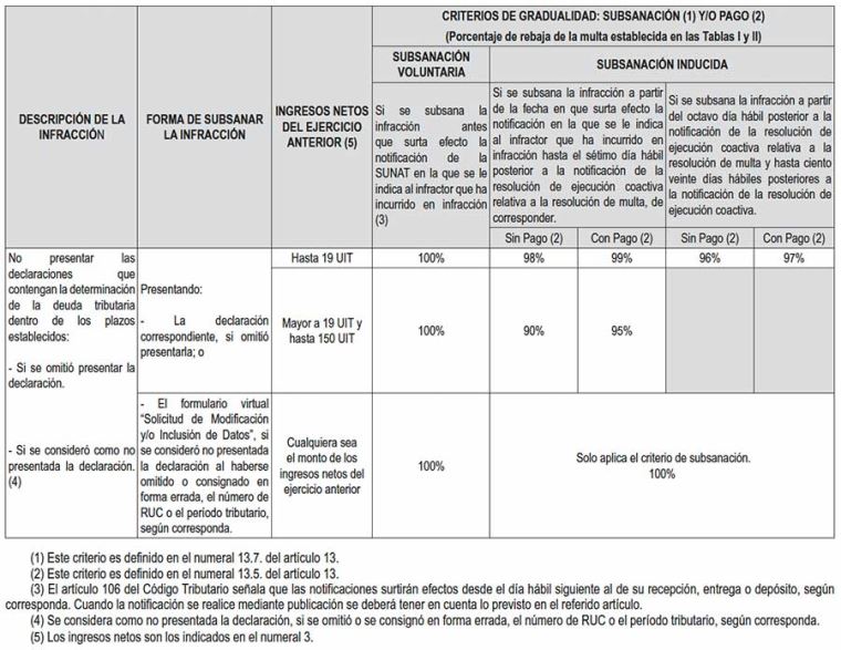 1. La sanción de multa aplicable a la infracción tipificada en el numeral 1 del artículo 176 del Código Tributario, respecto de las declaraciones correspondientes a los pagos a cuenta del Impuesto a la Renta por rentas de primera y cuarta categoría y la declaración anual del Impuesto a la Renta por rentas distintas a la de tercera categoría, se gradúa conforme a lo siguiente: