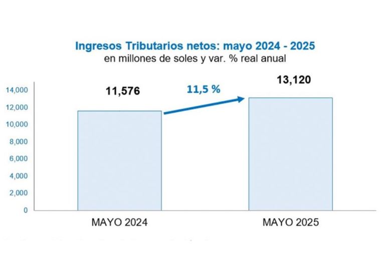 Los ingresos tributarios del Gobierno Central Netos en mayo (descontando las devoluciones de impuestos) alcanzaron los S/ 13 120 millones, experimentado un crecimiento de 11,5% con respecto al mismo período de 2024, con lo que la recaudación acumulada, entre enero y mayo de 2025, aumentó en 13,9% si se compara con similar período de 2024.