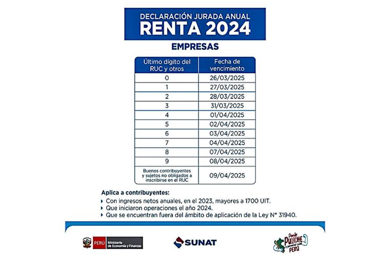 La Superintendencia Nacional de Aduanas y de Administración Tributaria (Sunat) informa que a partir de hoy, miércoles 26 de marzo, se inició el vencimiento para que los negocios y empresas (Rentas de Tercera Categoría) presenten la Declaración Anual del Impuesto a la Renta 2024, que culmina el próximo 9 de abril.
