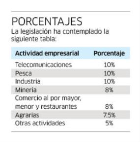El porcentaje por aplicar dependerá de la actividad que realiza el empleador considerando la información detallada en la Clasificación Industrial Internacional Uniforme (CIIU) de las Naciones Unidades, salvo ley en contrario. Por ejemplo, una empresa que pertenece al sector hidrocarburos repartirá 5%, pues su regulación, la Ley General de Hidrocarburos, hace que ingrese en la categoría denominada “otros”, lo mismo ocurre con las empresas del sector construcción.