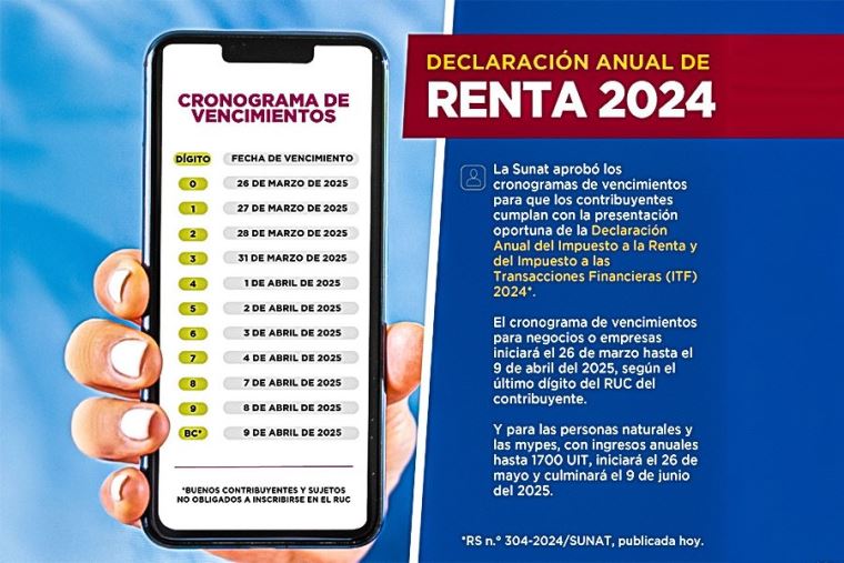 La Superintendencia Nacional de Aduanas y de Administración Tributaria (SUNAT) aprobó los cronogramas de vencimientos para que los contribuyentes cumplan con la presentación oportuna de la Declaración Jurada Anual del Impuesto a la Renta y del Impuesto a las Transacciones Financieras (ITF) del ejercicio gravable 2024.